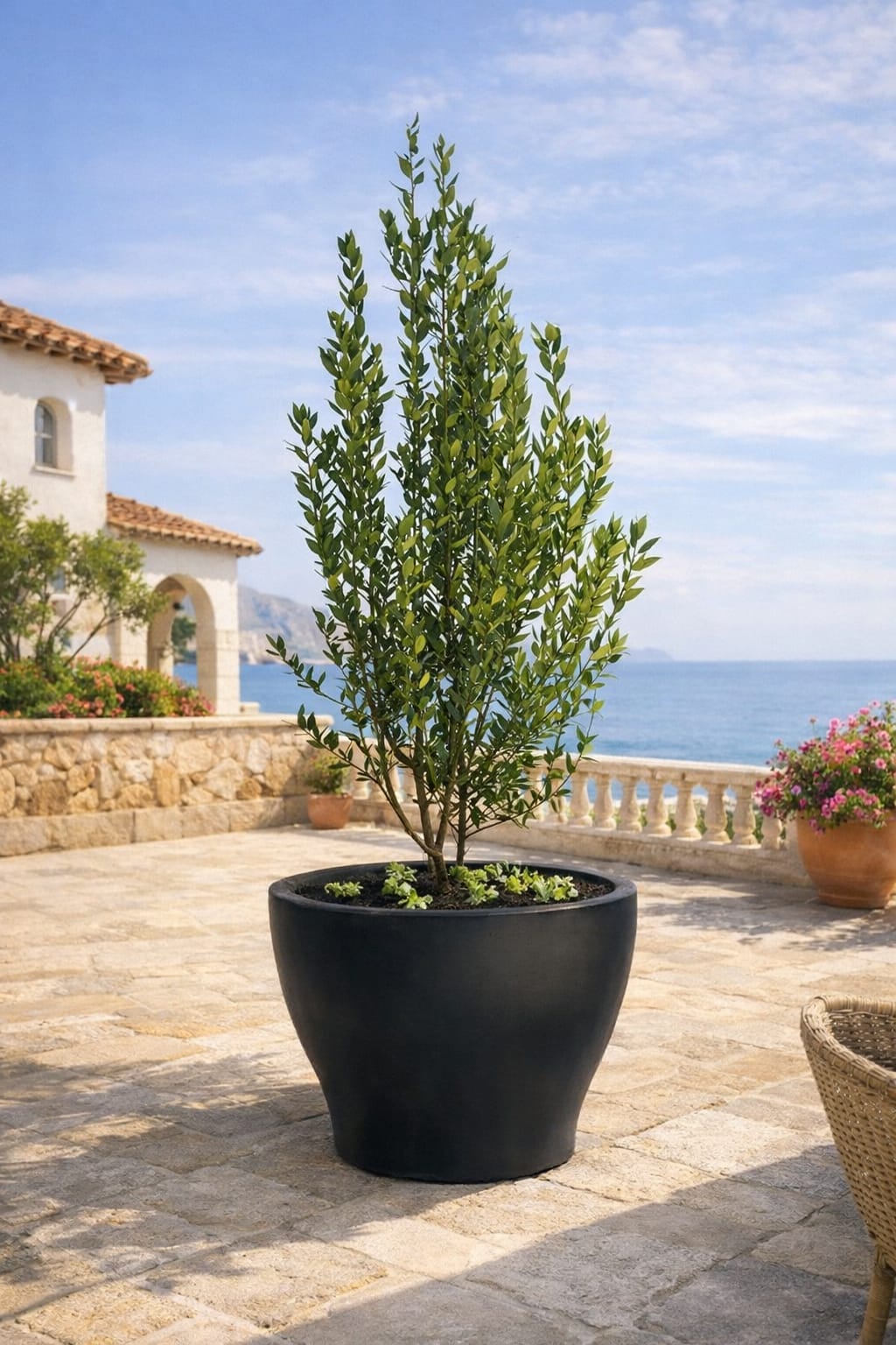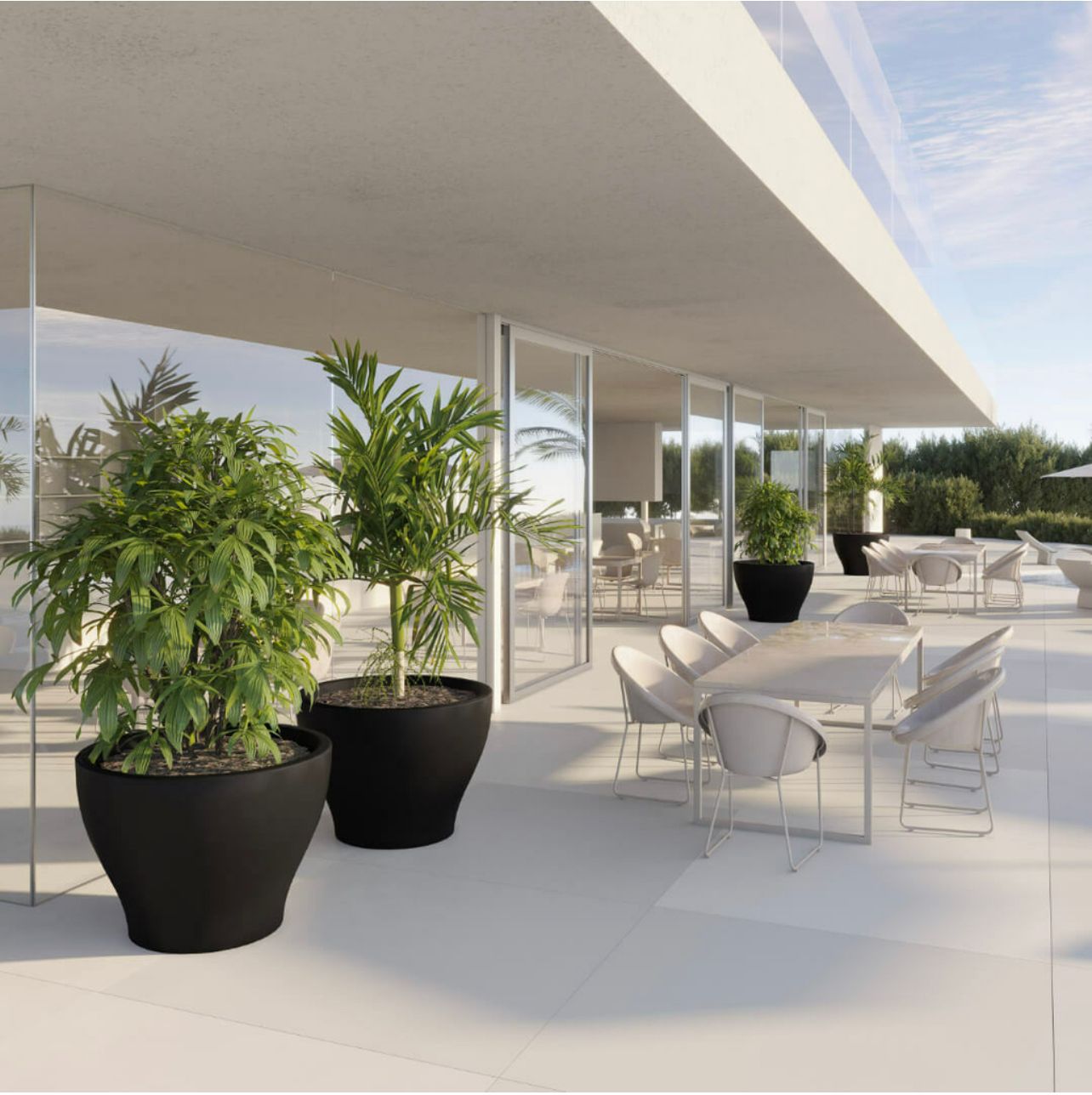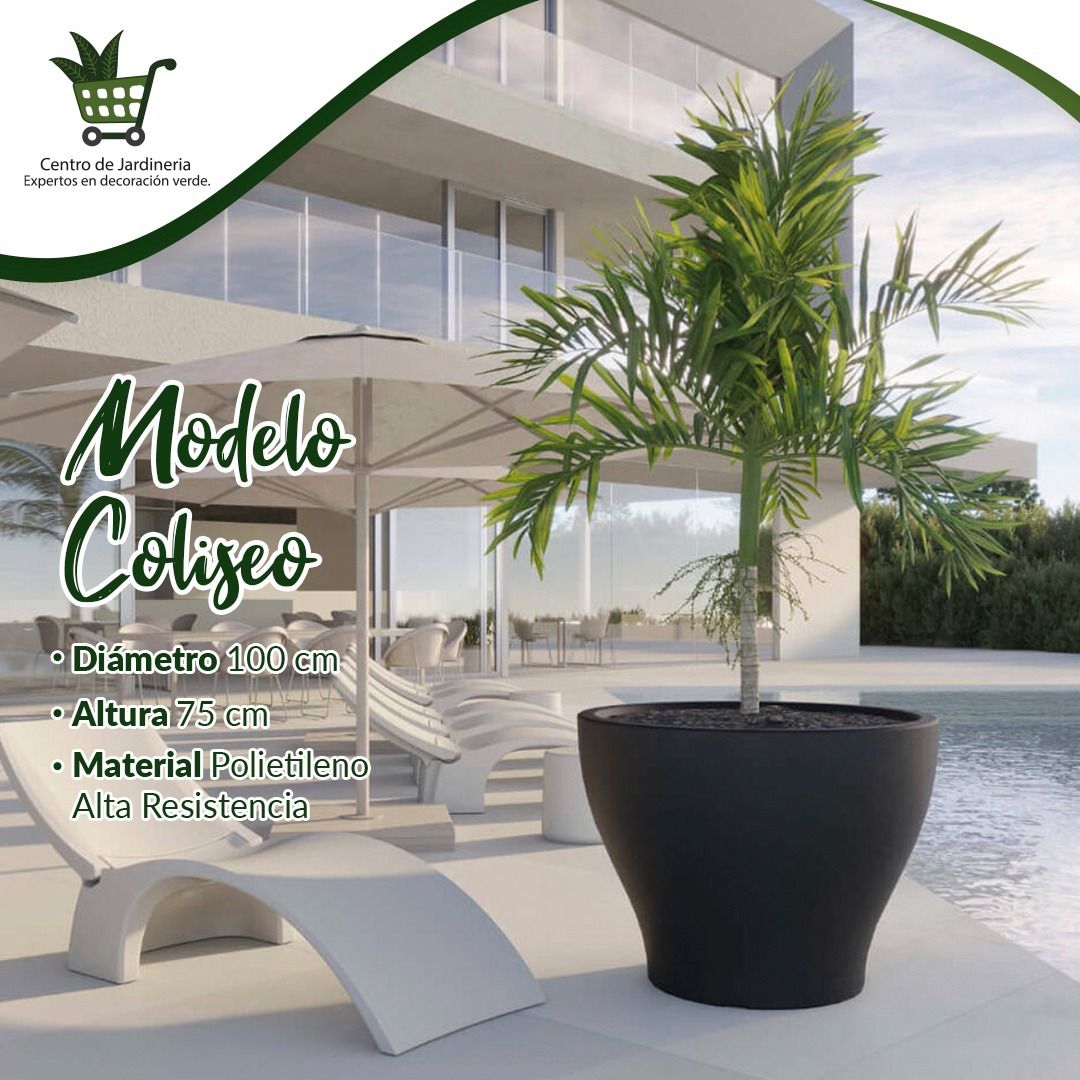 El gigante de la colección. Con un metro de diámetro, el Modelo Coliseo está diseñado para grandes exigencias. Es la solución definitiva para plantar árboles o palmeras en lugares donde no se puede plantar en el suelo directo. Su presencia es imponente y lujosa.