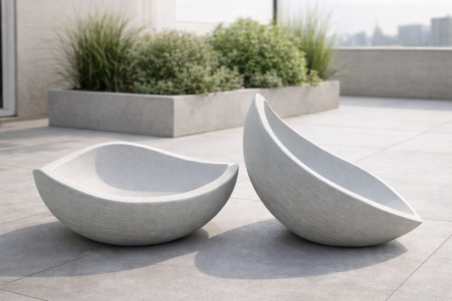 El Modelo Lotus es una pieza de diseño singular, baja y amplia, pensada para destacar a ras de suelo o sobre mesas de centro. Su acabado texturizado le da un aspecto de piedra natural, pero con la ligereza del polietileno de alta ingeniería.