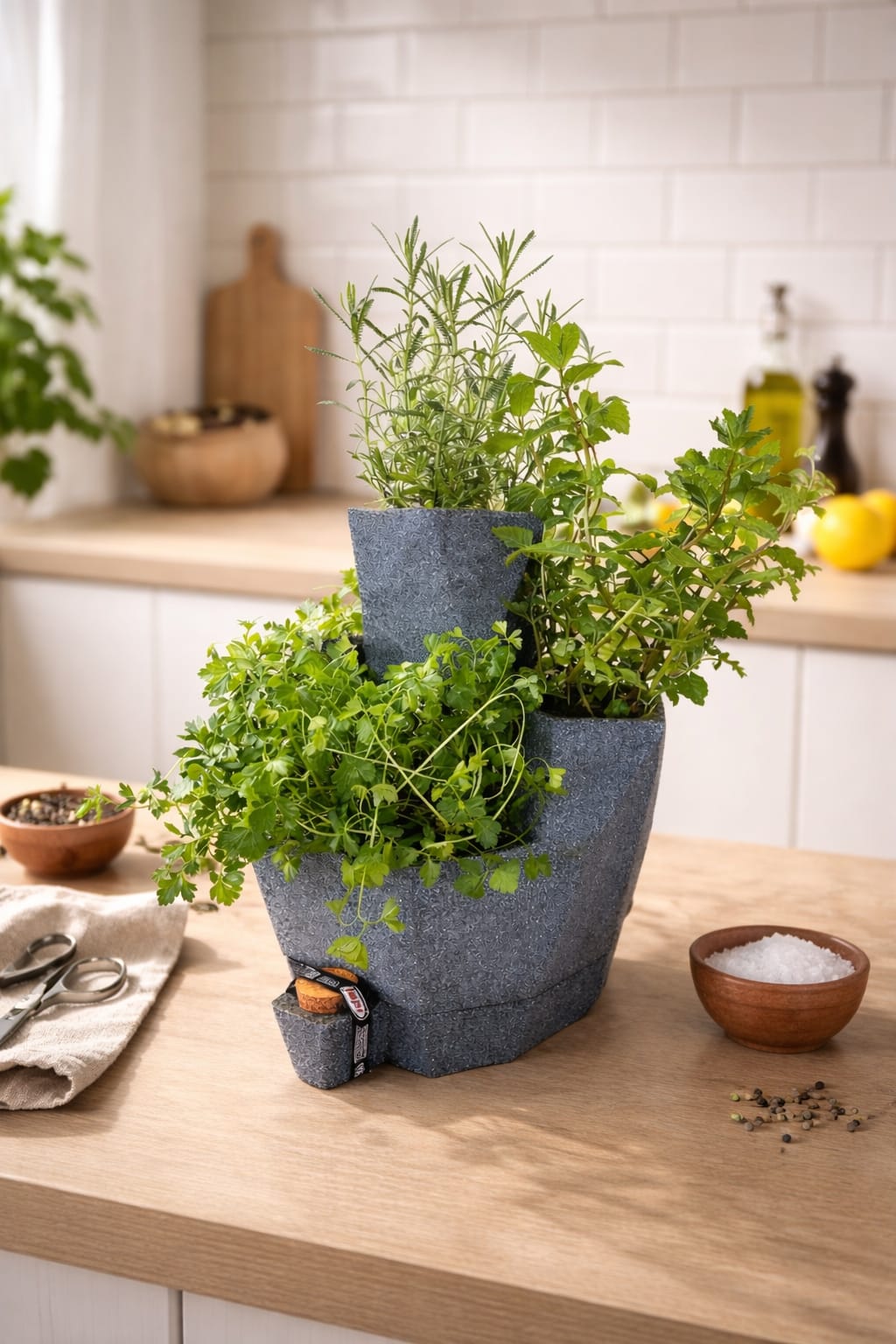 Este macetero para hierbas y condimentos de cocina combina diseño moderno, funcionalidad y naturaleza en un solo elemento. Su formato vertical y compacto permite cultivar varias hierbas aromáticas en un mismo espacio,